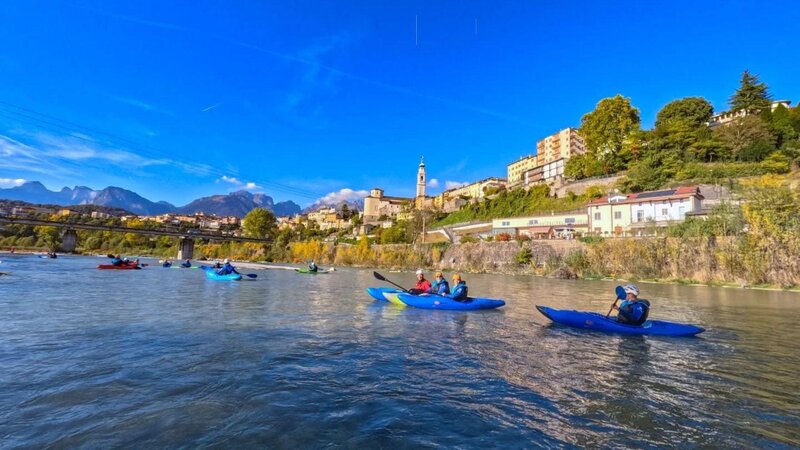 - 14:00 Uhr Treffpunkt in Ponte nelle Alpi (Ufer des Piave) mit Kayak, Kanu, Packraft, SUP, Raft