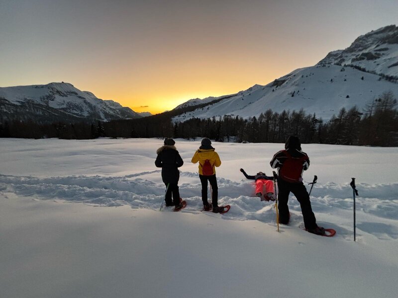Eine wirklich beeindruckende Schneeschuhwanderung, um die Magie des Waldes bei Sonnenuntergang zu entdecken, begleitet von Cristina, einer Médium-Montagne-Begleiterin (AMM).