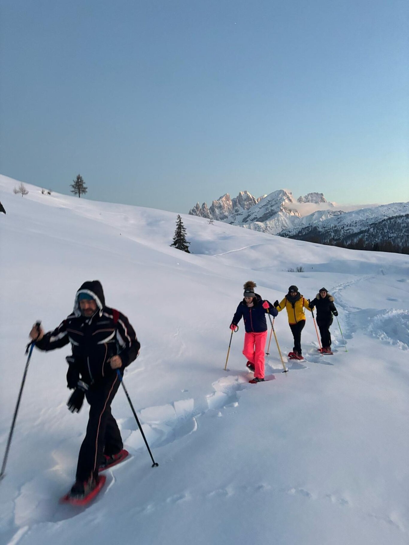 Schneeschuhwanderung bei Sonnenuntergang zwischen den Casoni der Valfreda