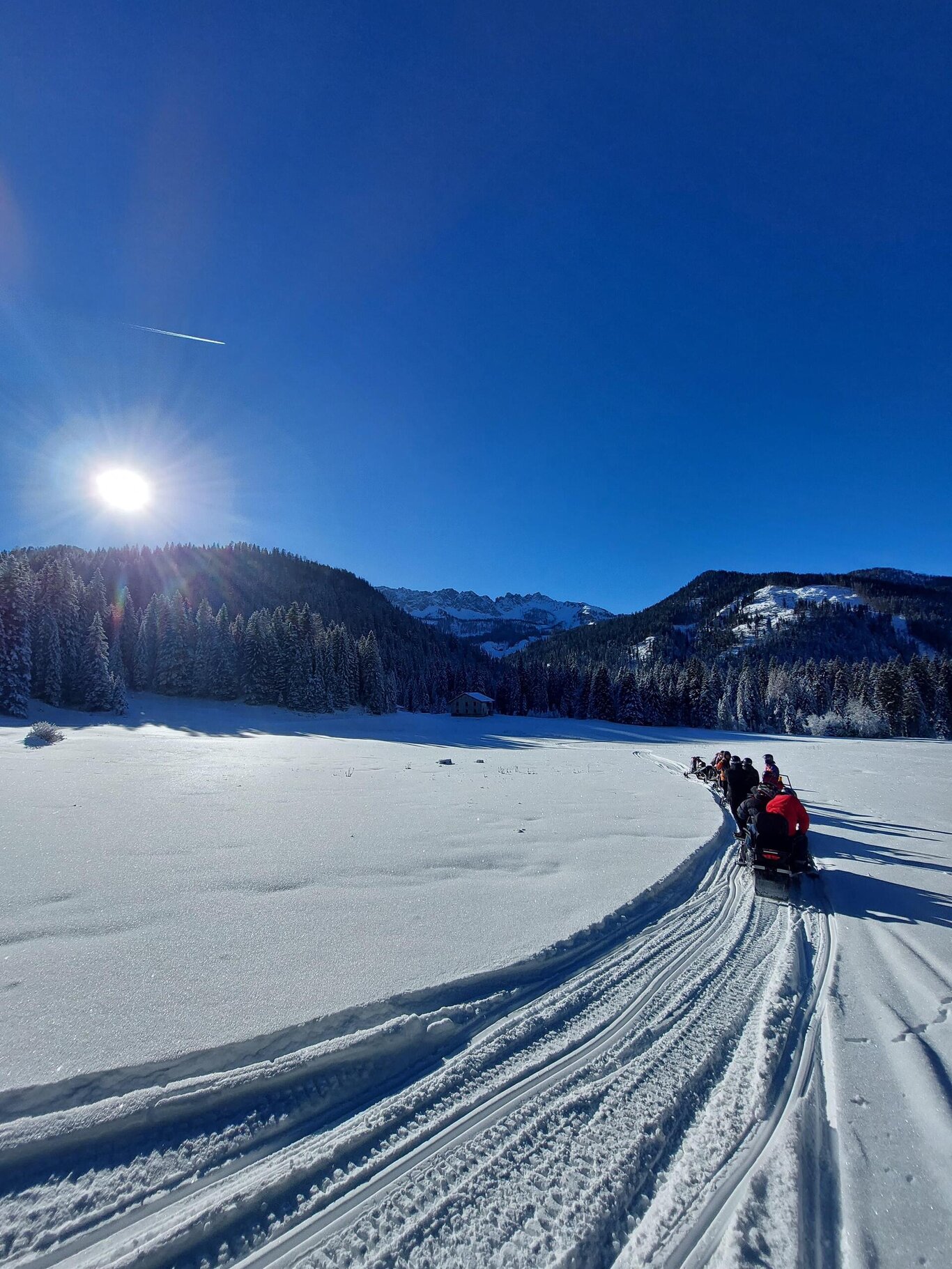Eine beeindruckende Fahrt mit dem Schneemobil, um die majestätischen verschneiten Landschaften der Dolomiten zu bewundern. Die Strecke führt durch Waldwege und in großer Höhe, um einzigartige Ausblicke auf die Welt zu genießen.