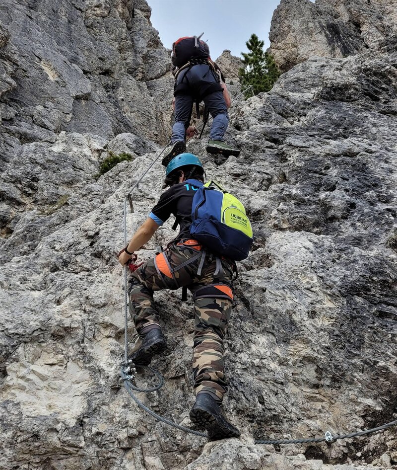 Diese angenehme Via Ferrata führt entlang der Nordwestwand des Sasso di Stria, zwischen den erstaunlichen Ausblicken der Dolomitengruppen Sett Sass und Lagazuoi.