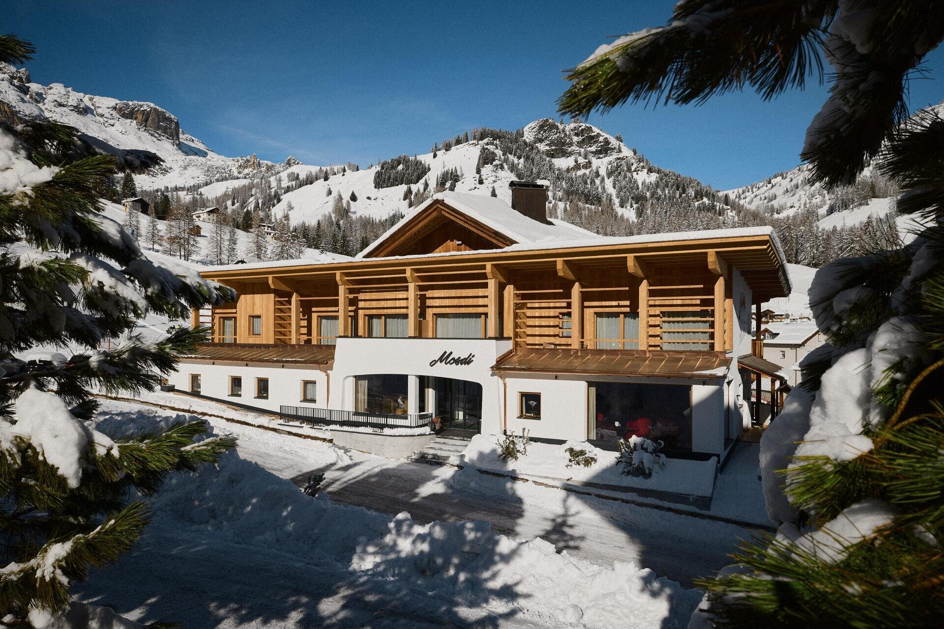 Unser Hotel befindet sich in sonniger und zentraler Lage, direkt gegenüber dem Sessellift "Burz" Sellaronda. Das Haus steht an der berühmten Großen Dolomitenstraße, die zum Pordoi-Pass führt, eine Pflicht- Etappe für Motor- und Radfahrer.