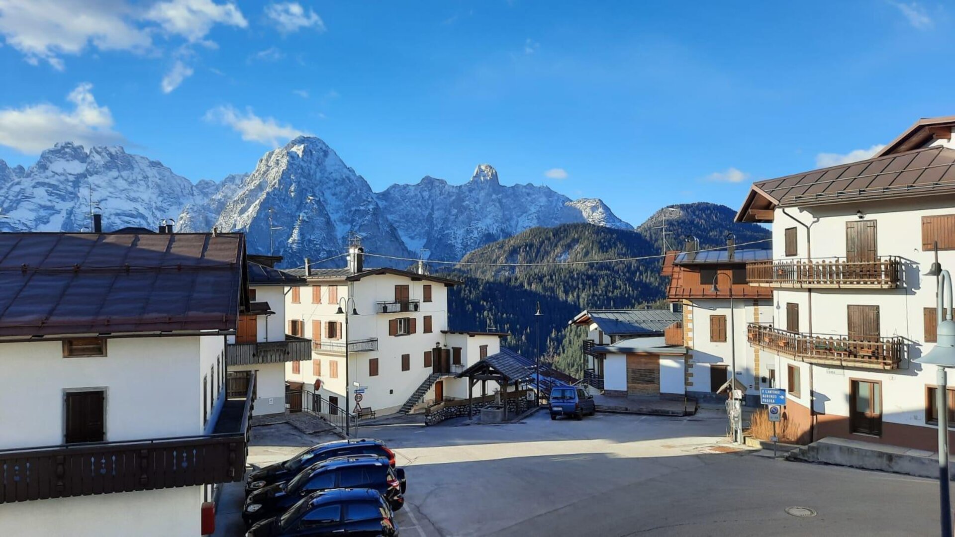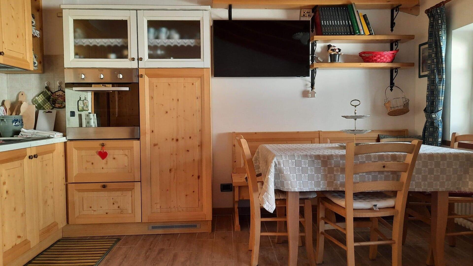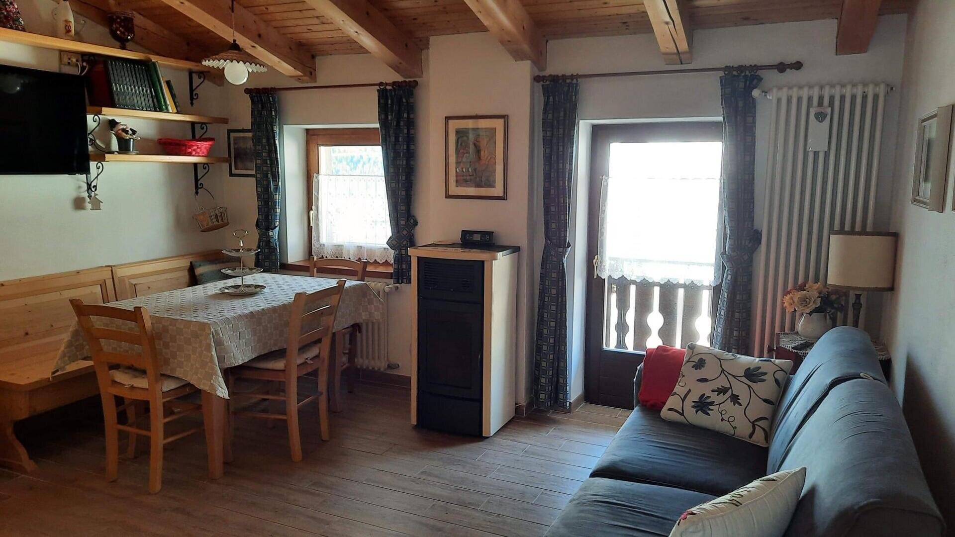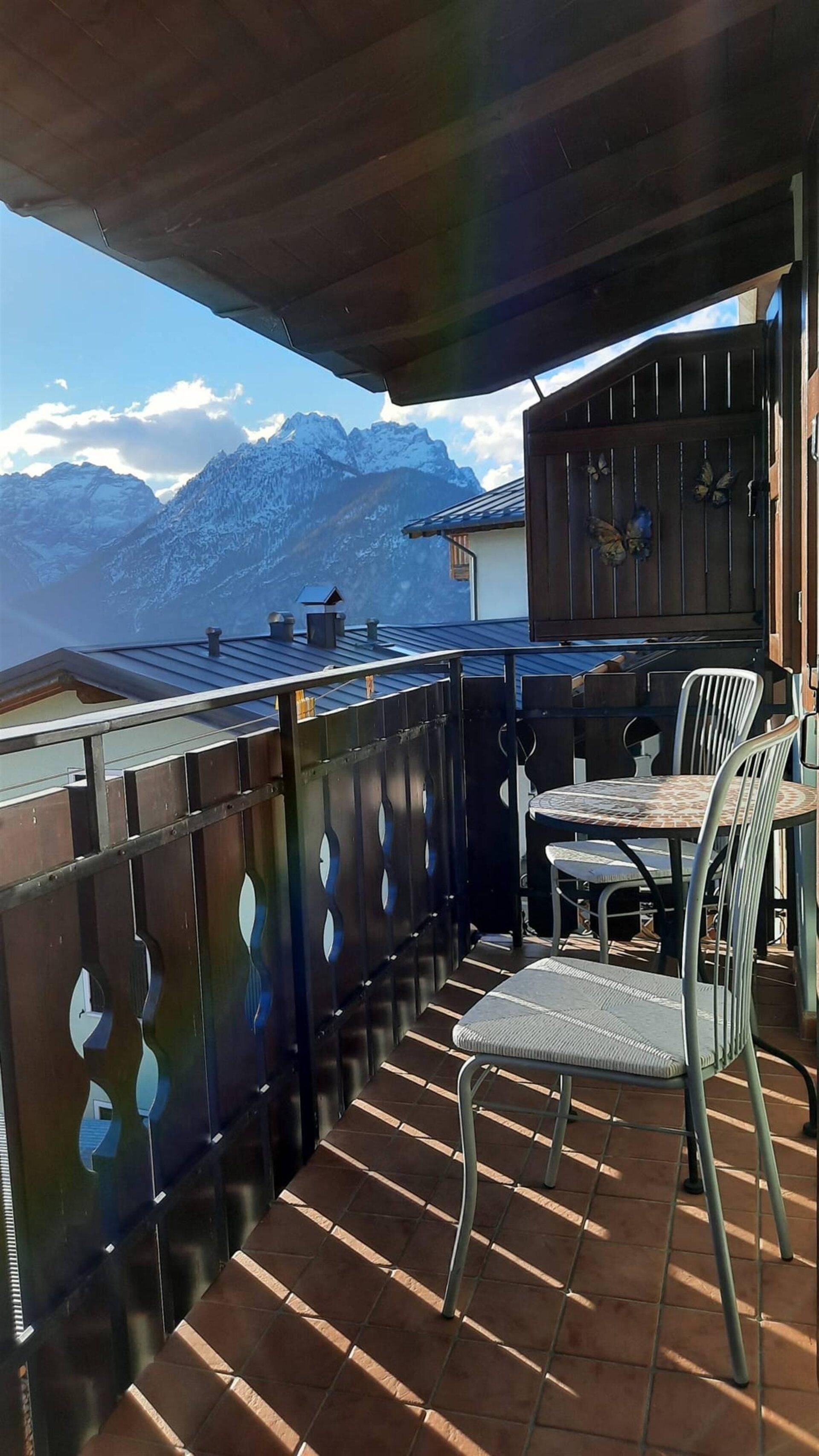 Romantisches Dachgeschoss mit tradizioneller Bergeinrichtung, Nord und Suedterrasse mit Panoramablick auf die Dolomiten der Region Veneto. Es besteht aus Kueche, Wohnzimmer mit Bettsofa, Doppelzimmer mit einem dritten Bett und Badezimmer mit Dusche. Maximale Ruhe und Privatsphaere.