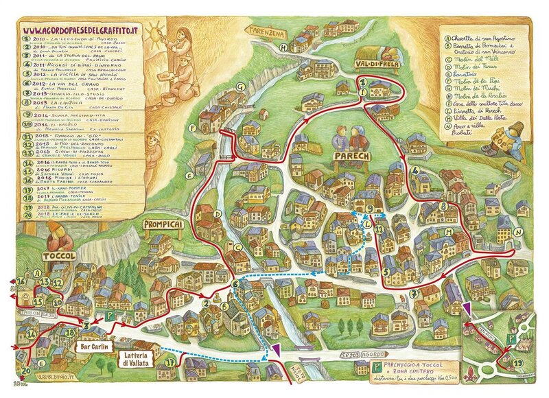 Agordo, Heimat der Graffitti, ist eine Initiative, welche im 2010 mit dem Ziel lanciert wurde, ein neues und spannendes touristisches Angebot für die Stadt zu erschaffen, indem man an Gebäuden eine antike Form von Fassadendekorationen (Graffiti) realisiert. Die ausserordentliche Kunstform besteht darin, einige Schichten Gips an die Wand zu streichen und anschliessend auf der äussersten Schicht eine Zeichnung zu schraffieren und somit die unteren Schichten je nach Bedarf zum Vorschein zu bringen. Die zahlreichen Kunstwerke können auf einem Rundgang durch die charakteristischen Gassen von Toccol, Parech und Prompicai bewundert werden.