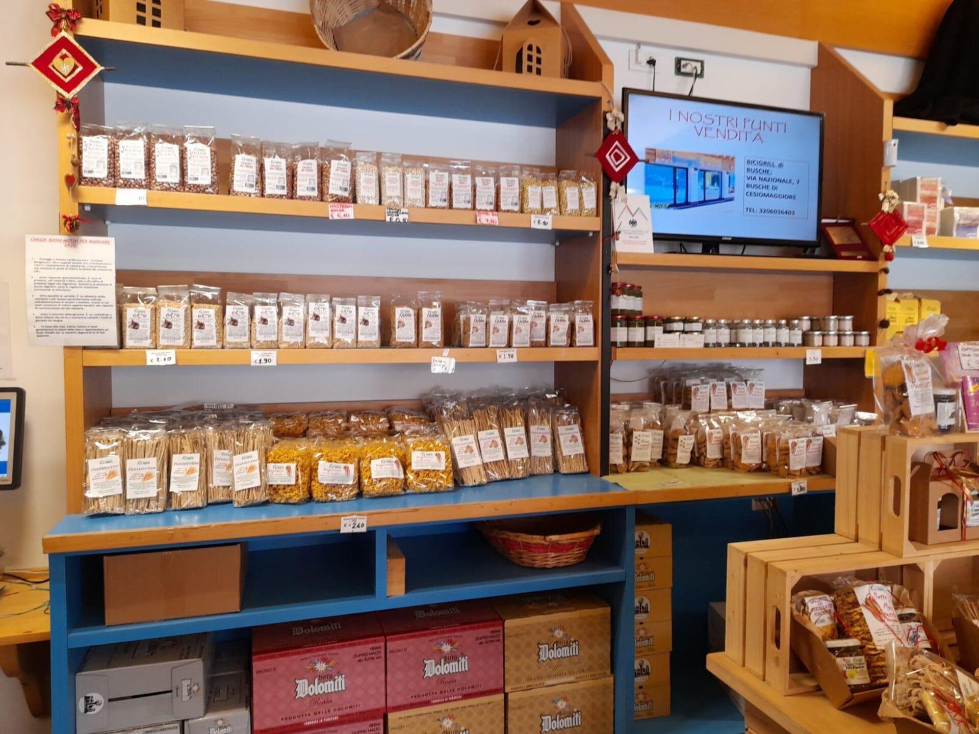In unserem Geschäft finden Sie lokale Agrarprodukte, beginnend mit Gerste, Dinkel, Speisemais und entsprechenden Verarbeitungsprodukten wie Mehle, Pasta und Keksen. Sie finden auch lokales Obst und Gemüse, darunter die De.Co-Kartoffel von Cesiomaggiore und viele andere Produkte unserer Mitglieder, die alle strikt aus lokaler Produktion stammen.