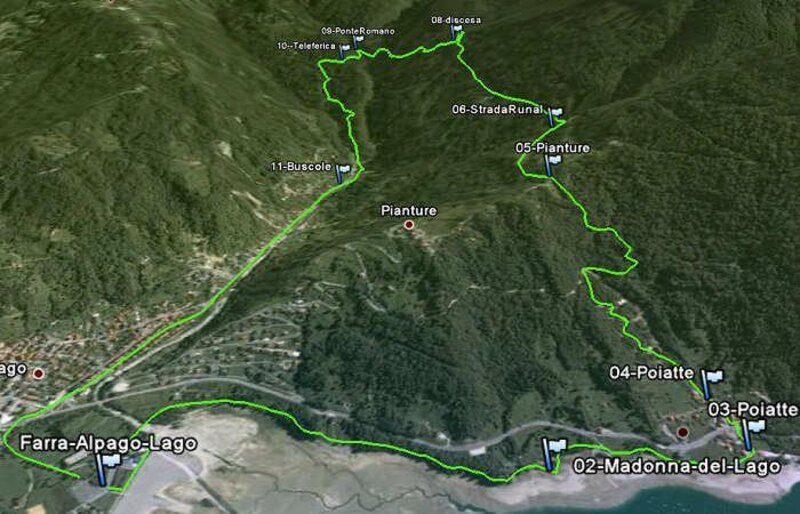 Man startet vom Pfad, der den See entlangführt, bis man Poiatte erreicht, von wo aus der Anstieg zur Gemeindestraße nach Mezzomiglio beginnt. Umgeben von einer schönen Vielfalt an Vegetation, biegt man an der Gabelung in Richtung Madonna del Runal ab, wo sich eine Kapelle befindet, ein bekannter Ort der marianischen Verehrung, der auch über die Grenzen Alpagoti hinaus bekannt ist. Angekommen an der Kapelle, die aufgrund einer sehr populären Legende errichtet wurde, nimmt man den abwärtsführenden Pfad, der in kurzer Zeit zu den Schluchten des Vallon Runal und des Vallon di Spert führt, wo sich die beiden alten Brücken befinden, die als 'römisch' bezeichnet werden. Nach dem Verlassen des verlassenen Weilers Tomas nimmt man den Pfad links, der zum Bach Runal und nach Buscole führt.