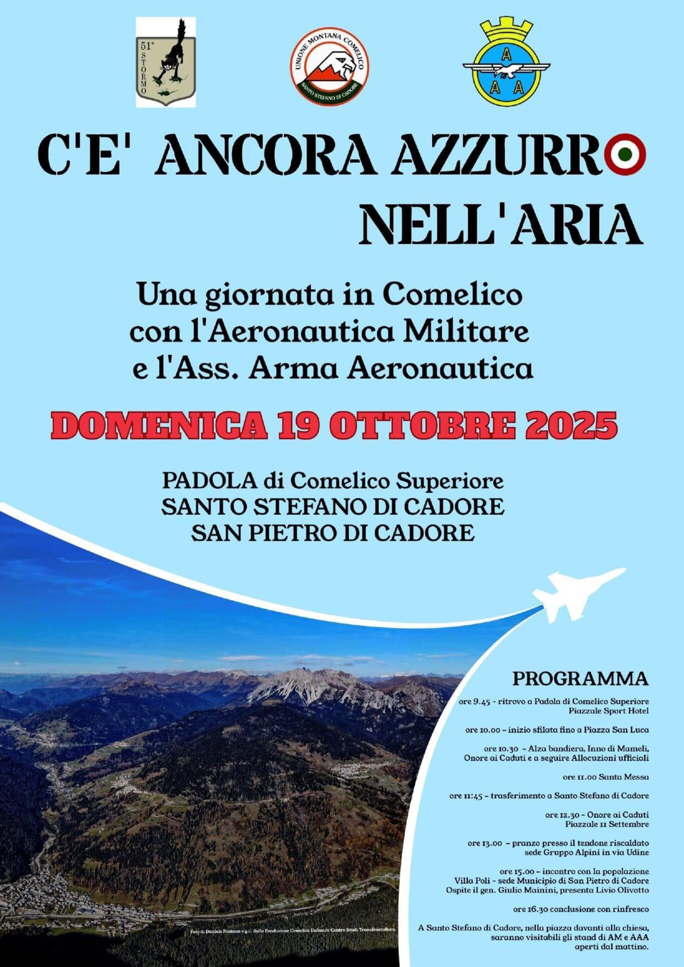 organized by the Comelico Mountain Union, in collaboration with the 51st Wing of Istrana of the Air Force and the Aviation Armed Forces Association. The event will take place in the municipalities of Comelico Superiore, Santo Stefano di Cadore, and San Pietro di Cadore, according to the program on the poster.