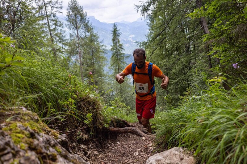 At an altitude of 1170m, we leave the main trail to take the Triòl del Vach de Mezodì, a less-traveled variant that will lead us, through woods and clearings on a now more runnable and faster path, to the old pasture of Casera del Mezodì (1350 mt). The trail returns to the forest and, after a still flowing stretch, deposits us at the foot of the Valòn Pìcol, where the final steep section awaits us on a winding trail to finally climb to the small plateau of Sora 'l Sas and then to the finish line.