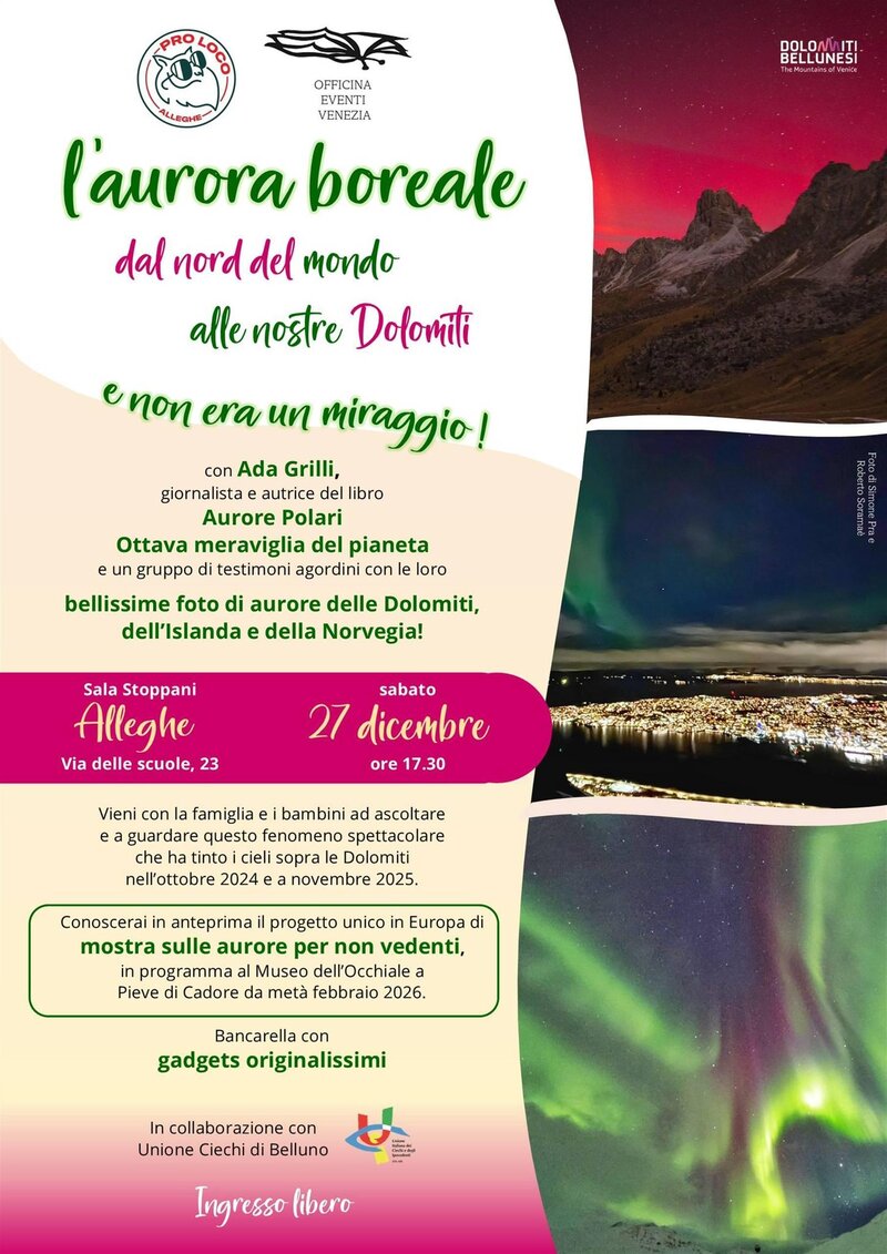 With Ada Grilli, journalist and author of the book "Polar Auroras Eighth Wonder of the Planet," and a group of Agordino witnesses with their beautiful photos of auroras from the Dolomites, Iceland, and Norway.