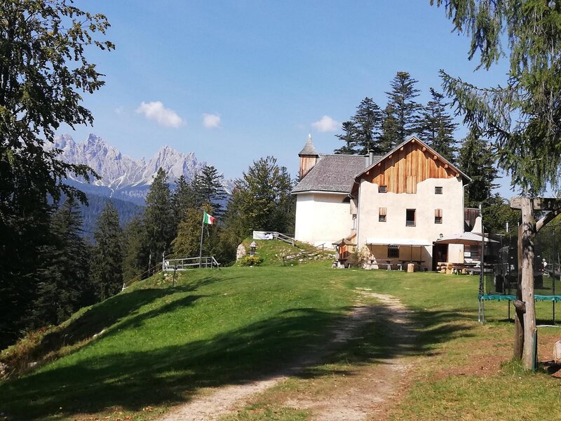 From the parking lot beyond the bridge over the lake of Centro Cadore (municipality of Domegge), we ascend into the woods via a path or dirt road until we reach this place that was chosen by a group of hermit monks in the 18th century. They built a church, a convent, and chapels in the woods. Their simple story is intertwined with the great European history, and we will discover how. The main building has been renovated and now houses a cozy refuge open all year round, a balcony overlooking Centro Cadore.
