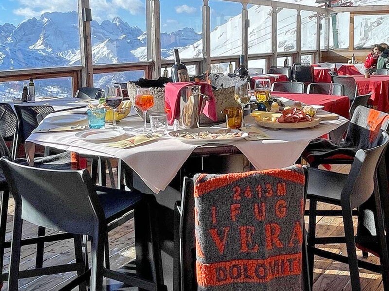 A rich sweet and savory buffet awaits you, accompanied by a breathtaking view of Marmolada, Tofana di Rozes, and Civetta, amid golden lights and breath-taking silences.