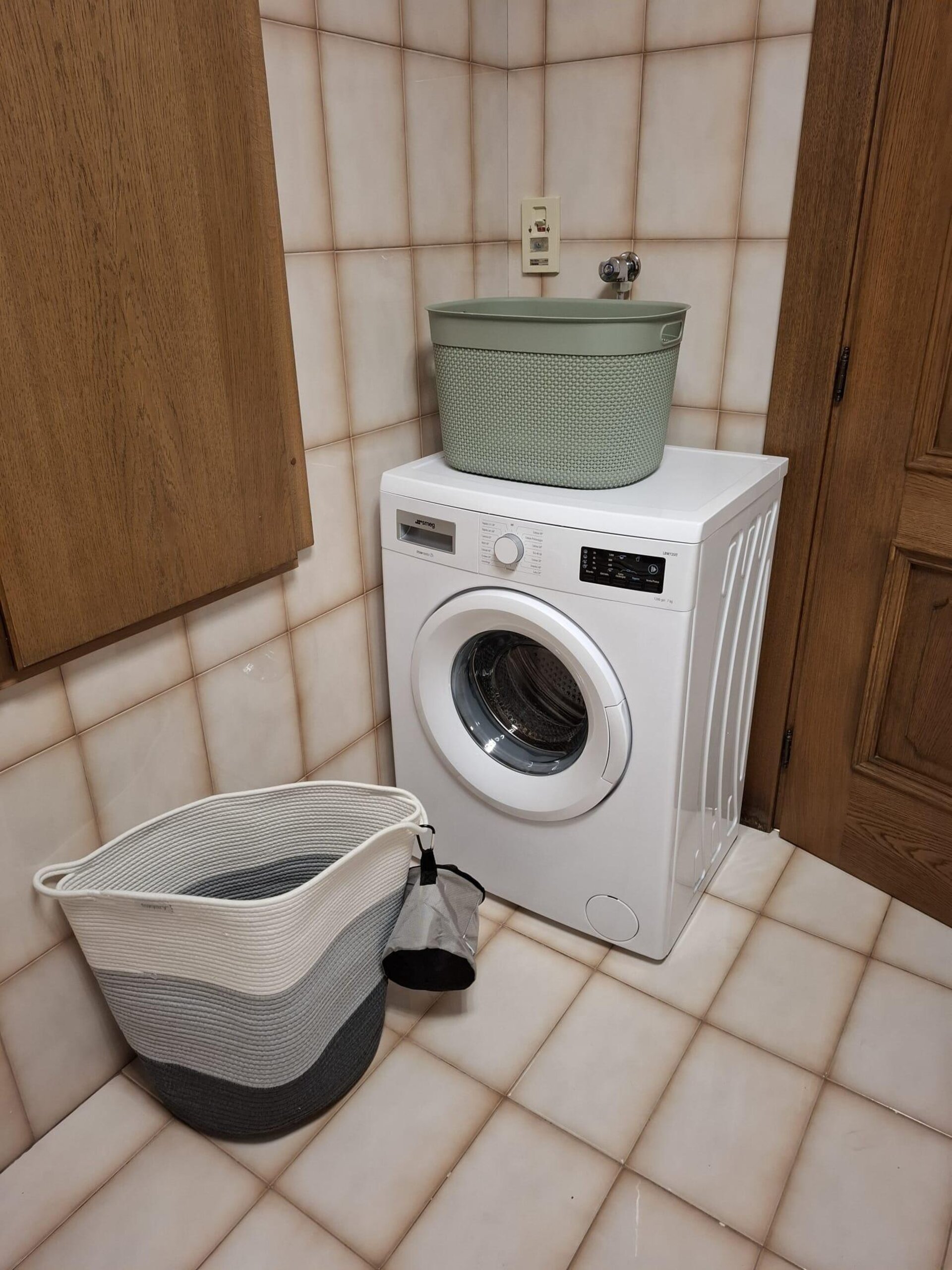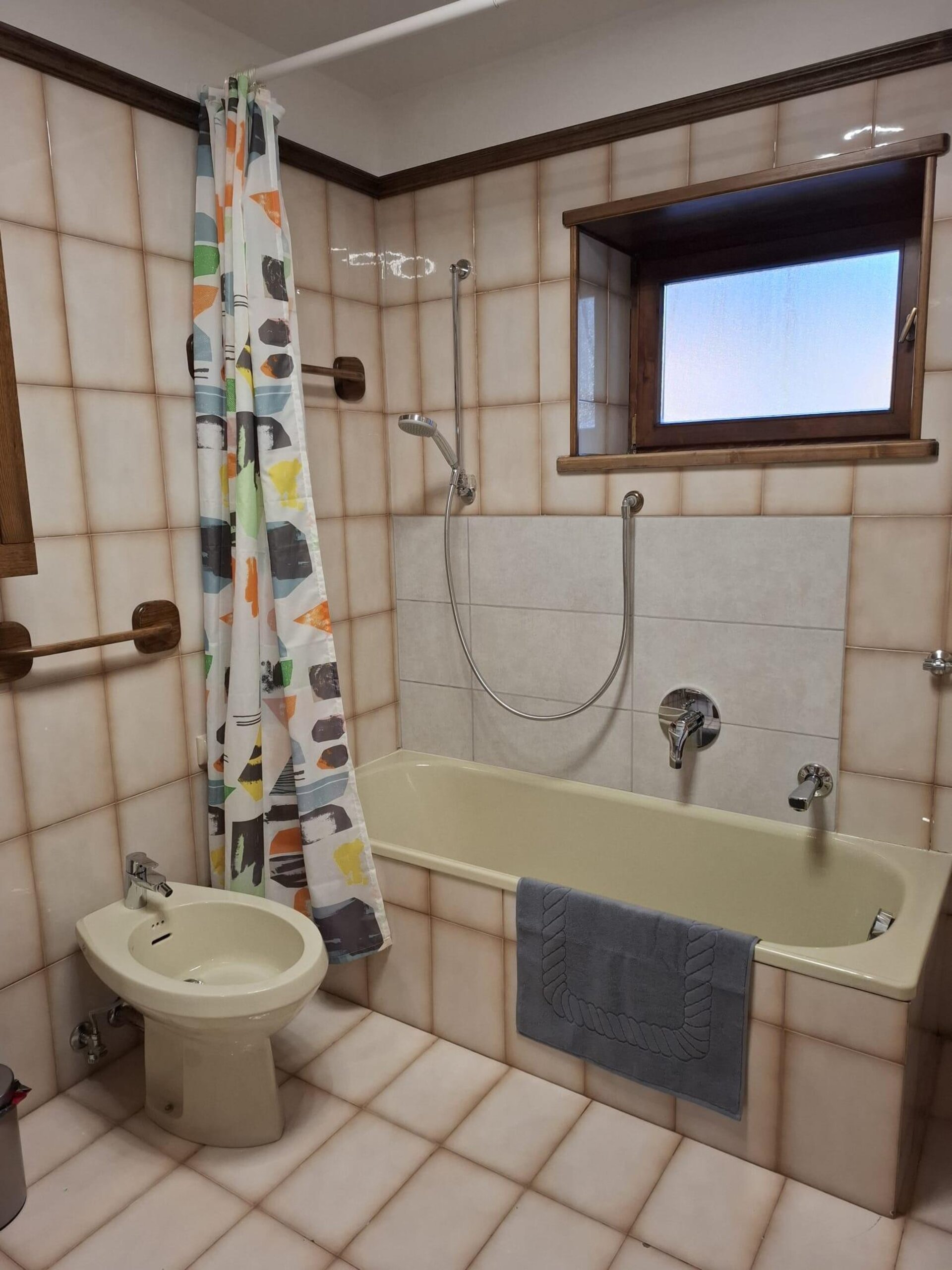 A bathroom with a bathtub (approximately 60 cm wide and 140 cm long) and a bidet, complete with towels and a hairdryer. Equipped with a washing machine and a clothes drying rack.