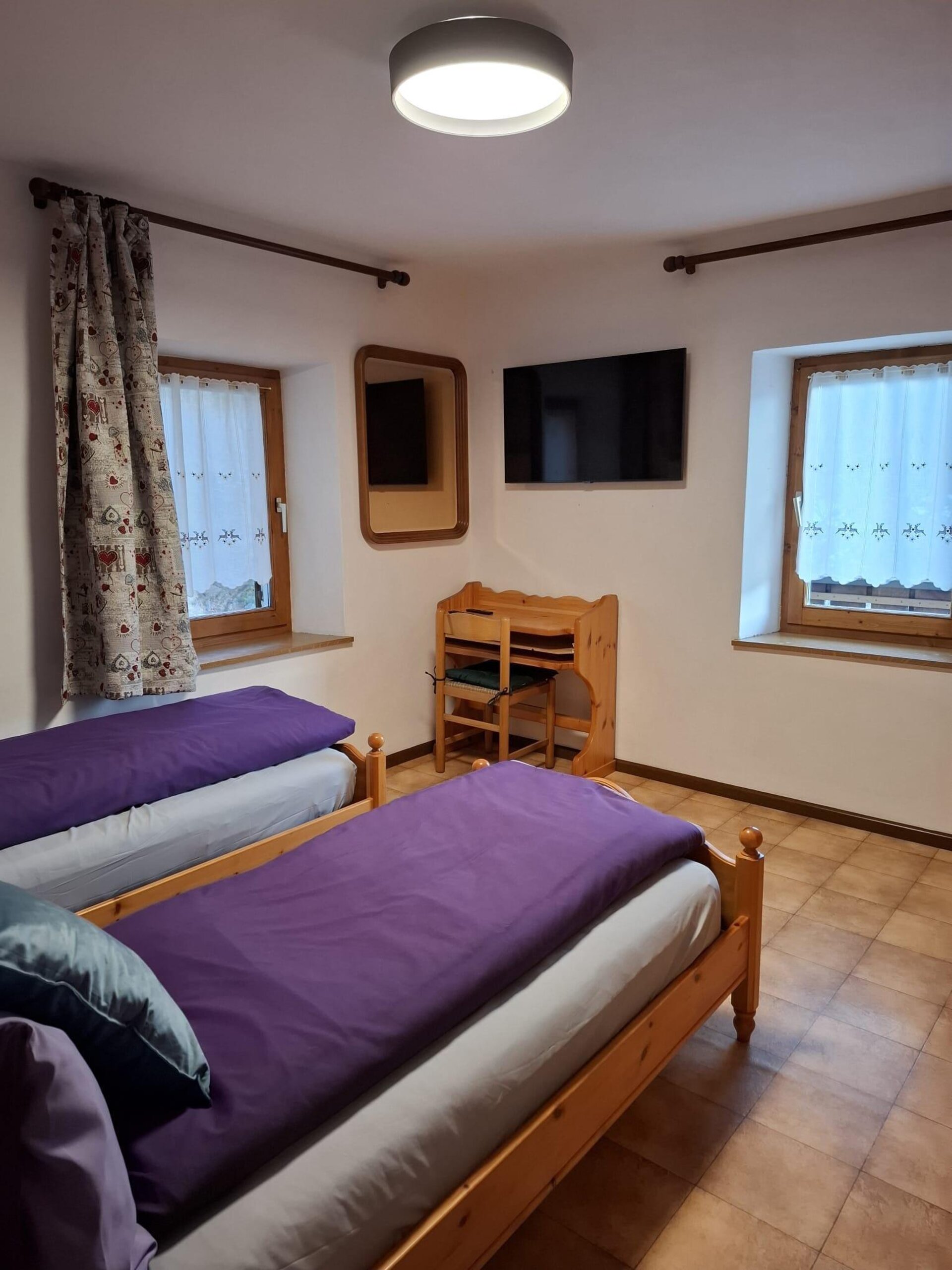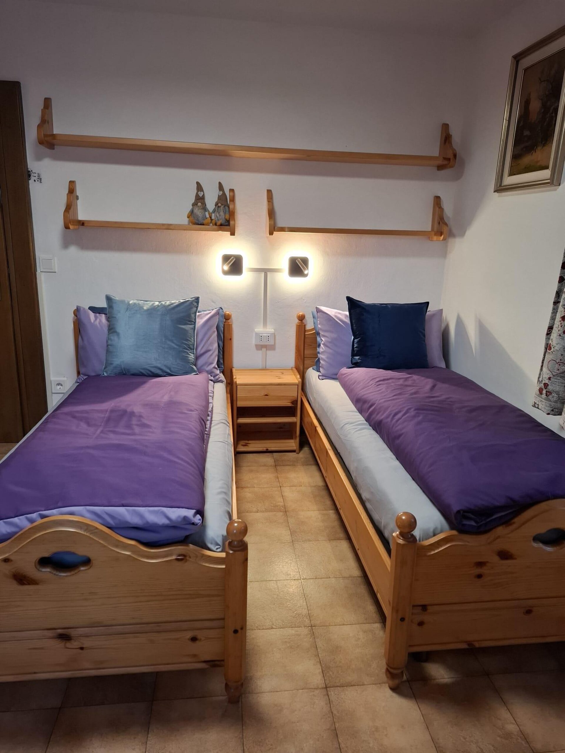 The apartment includes a double bedroom and one with single beds, both equipped with bed linen and televisions.