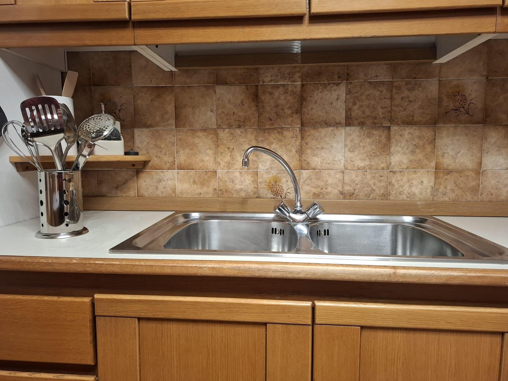 The kitchen includes a stove, oven, dishwasher, electric coffee maker, refrigerator and small freezer, kettle, pots, dishes, glasses, plates, cups, tablecloth, and dish towels. Waste separation and general cleaning detergents are provided. Please note that the apartment is cleaned after each departure for a fee; no intermediate cleaning is scheduled.
