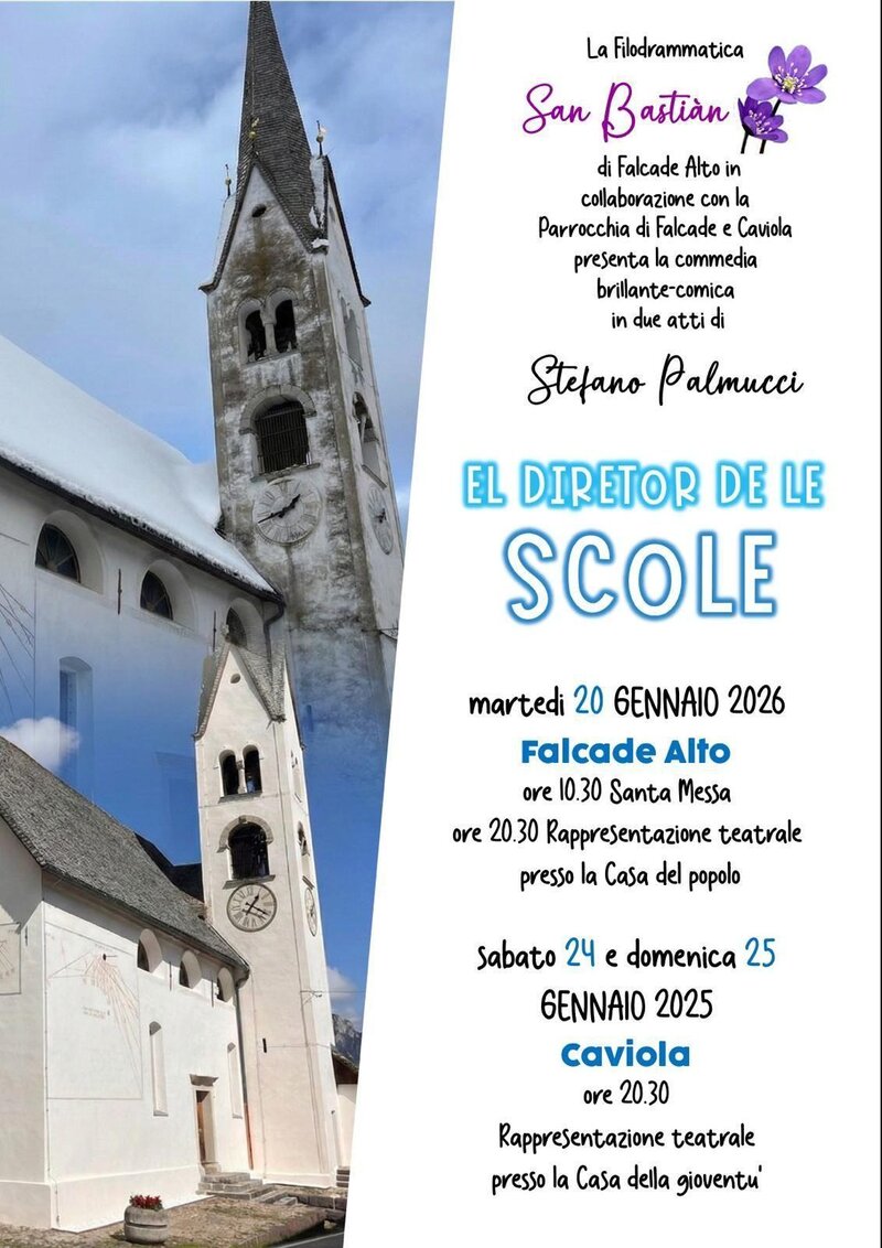La Filodarmmatica di Falcade Alto presenta "El diretor de le scole", commedia brillante-comica in dialetto falcadino in tre atti di Stefano Palmucci presso la Casa della Gioventù di Caviola.
