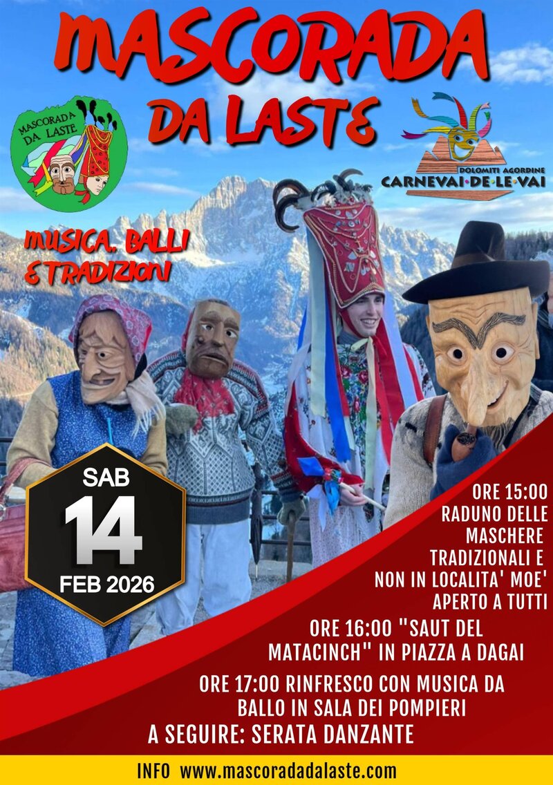 Scopri di piùLa tradizionale Mascorada nel paese di Laste di Rocca Pietore è il tipico carnevale ladino che si tramanda di generazione in generazione ed ogni anno viene impersonato dai giovani del territorio.