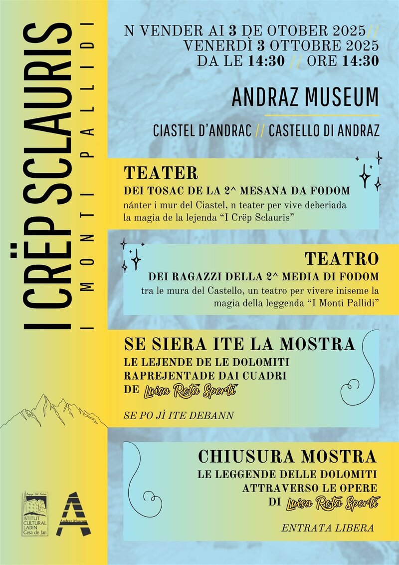 Alle ore 14:30 i ragazzi e le ragazze della classe 2ª media di Fodom (Livinallongo del Col di Lana) presenteranno una rappresentazione teatrale ispirata alla celebre leggenda dei Monti Pallidi, portando in scena atmosfere fiabesche e tradizioni secolari.